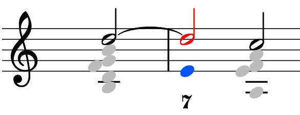 Als dissonierend gilt also derjenige Ton des dissonanten Intervalls, der zur Synkope gehört. Der andere Ton des Intervalls (die blau gefärbten Noten in den Beispielen) gilt als konsonant.
