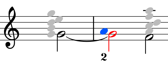 Die grau gefärbten Noten vor dem Taktstrich zeigen mögliche konsonierende Töne zum ersten Teil der synkopierten Note. Die grauen Noten nach dem Taktstrich bilden konsonante Intervalle zu ihrer Auflösung.