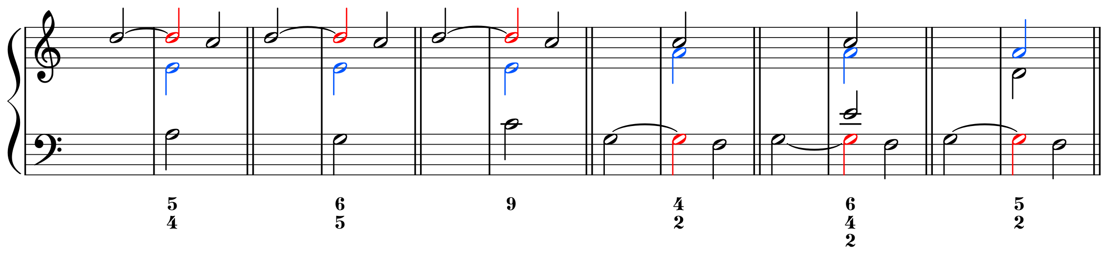 Die rot gefärbten Noten in den folgenden Beispielen sind Synkopendissonanzen. In der Kontrapunktlehre bezeichnet dieser Begriff eine bestimmte Art und Weise, wie dissonante Intervalle verwendet werden können.